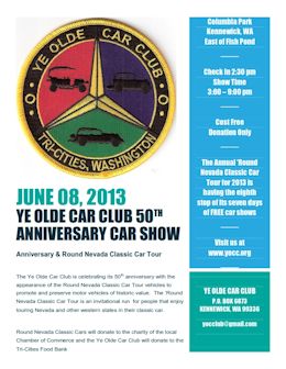 January7th Annual Winter Rod and Speed Show is Saturday, January 5, 2013 from 9 am to 7 pm located at the Linn County Fair and EXPO Center, Albany, Oregon. The women's luncheon will be at Rosie’s Dinner in Richland, at 1 pm, on January 10th, to be hosted by Ginger Vetrano. Please RSVP her at 783-9205. Pizza Party! Round Table Pizza on the corner of Gage and Leslie in Kennewick. January 24th starting at 6PM. Discount. FebruaryChocolate extravaganza at the Vetrano's home on 4512 W. Yellowstone Ave., Kenn., February 15, 7-9PM. Bring chocolate dessert or candy. Beverages available. MarchSt. Patrick's Day Cruz-in, March 16, 8AM-3PM, Heppner, OR. $20 registration fee, or $15 in advance. Vehicles will be parked and displayed on "Willow Street" between Heppner Family Foods and St. Patrick's Senior Center. We will caravan to Heppner on the 17th, meeting at the Kennewick Flashcube building at 8:30AM. Sunnyside annual high school show and shine fundraiser, March 23rd, 10:30AM, Clem Senn football field. AprilPortland Swap Meet, Expo Center, April 5 to April 7, 7am-7pm Fri, 7am-5pm Sat, 8am-1pm Sun. Admission 12yrs and over is $7/day Fri. - Sat., $4 Sun. Ladies free. Apple Driving & Picnic Tour to Broetje Orchards located between Burbank and Prescott. April 24th. Meet at 1110 Osprey Pointe Blvd. and E. Ainsworth St. at 10AM. Myrtle has sub sandwiches and apple cake, Deb will have banana cake, and Dolores will provide coffee. Kiona Winery Visit, April 25, 1PM. Meet in the Sterlings parking lot at noon to caravan. Croissant sandwiches, cheese, crackers, bottle water and wine will be provided on the deck. It's suggested chairs be brought in case there aren't enough. Benton City Show & Shine, April 27th. Kiona-Benton City Middle School. Registration starts at 7AM, opens at 9AM, flag raising at 10AM, awards ceremony at 2:30PM. A pancake and sausage breakfast is available for $5. Vehicle registration is $20. MayAnnual YOCC Swap Meet on May 4th. Contact Ron Smith at 628-9662. Walla Walla Balloon Stampede, Car and Cycle Show, Saturday May 11th, Fairgrounds, 10AM-4PM. Classy Chassy Show & Shine, Saturday May 11th, Downtown Kennewick, 8AM-4PM. See photos. Life Care Center, 7th and Olympia, Kennewick, May 15th, 11AM - 3PM. Contact Laura Cruz, 586-9185, for more information. Waitsburg Car Show, May 17-18, 8AM - 3PM, Preston Park. Monroe Swap Meet, Evergreen Fairgrounds, May 18-19, 8AM-5PM. Info 800-645-4997. Reservations (425) 392-3613, Chuck McLeod. American Reflections car show, May 19, 9AM - 3PM, Rivard Rd., Moxee park, hwy 24. Canyon Lakes Manor lunch, May 24th, Noon-2PM, 2802 W 35th Ave. Contact Joe Green, 396-2028, for more information. Moses Lake Spring Festival Car Show, May 25th, 8AM-3PM, 3rd Ave. and Dogwood. Ki-Be all school reunion picnic and car show, May 25th, 10AM-3PM, Benton City Community Center. Pacific Northwest Mustang Club show and shine, May 26th, 9AM - 3PM, Howard Amon Park, Richland. JunePendleton Old Iron Show, June 1-2 at 1205 SW Court Ave., Roy Raley Park next to the rodeo grounds. Lunch and dinner provided to exhibitors. Free admission. Kahlotus Days Car Show, June 1. Registration 9AM, parade at 10AM, judging 11:30, awards 2PM. For pre-registration and more details, see brochure.